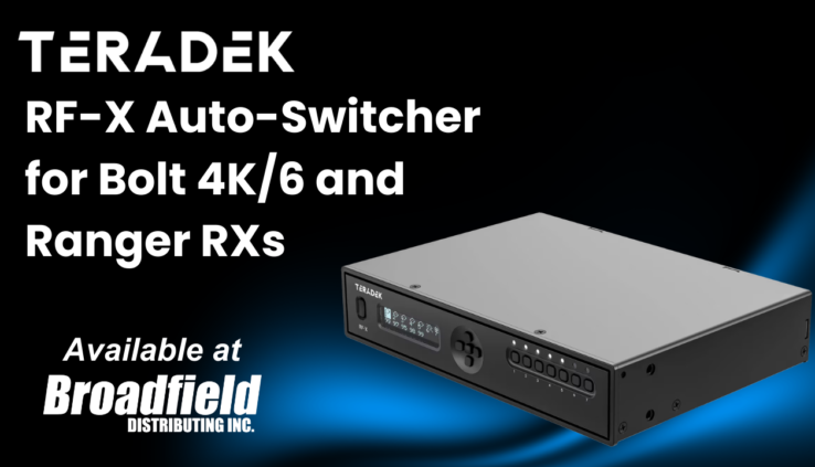 Need reliable wireless video in tough RF environments? RF-X auto-switcher monitors up to six Teradek Bolt or Ranger receivers and automatically selects the strongest signal for a seamless 12G-SDI output—no delay, no manual switching. Perfect for live events, sports, and cine productions. Call your Broadfield sales rep at 800-634-5178 to learn more.