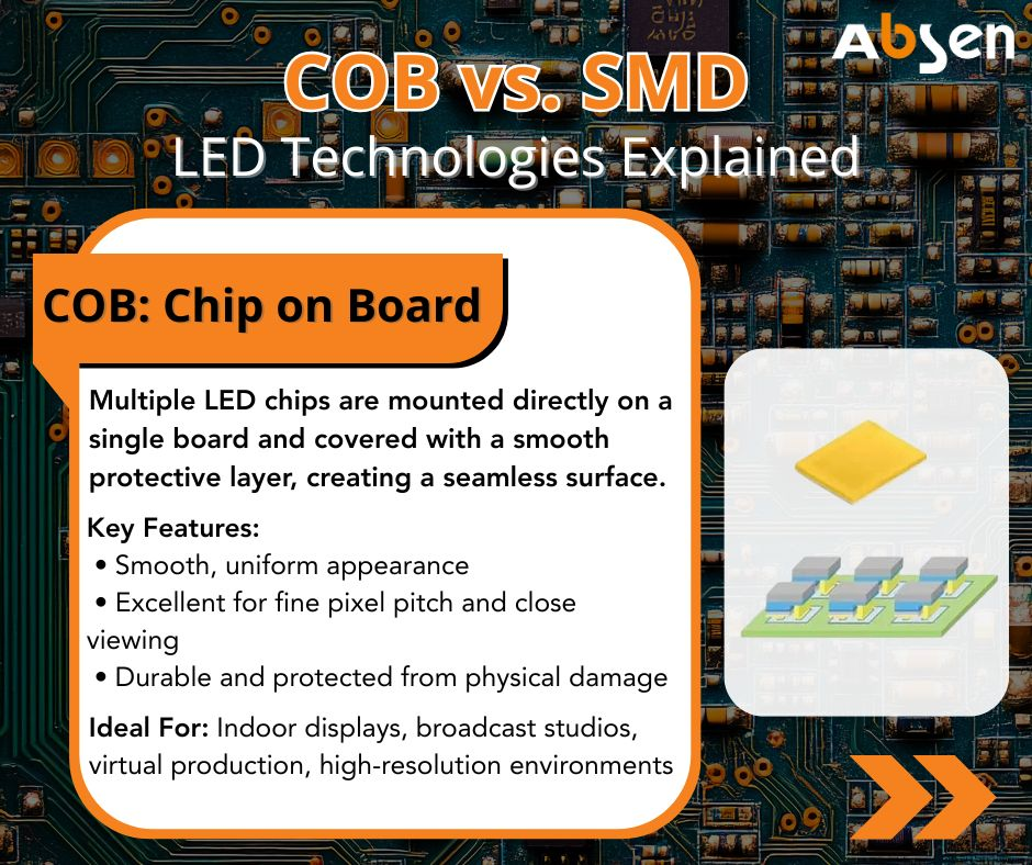 COB and SMD are two powerful LED technologies, each offering distinct benefits depending on your application. Chip-on-Board (COB) provides a seamless, highly durable surface ideal for close-range, high-resolution environments, such as studios, XR stages, and control rooms. In contrast, Surface-Mounted Device (SMD) LEDs are bright, modular, and well-suited for large-scale displays, events, and dynamic outdoor installations. Whether you’re designing immersive indoor visuals or impactful outdoor signage, Absen delivers both COB and SMD solutions to match your needs.
