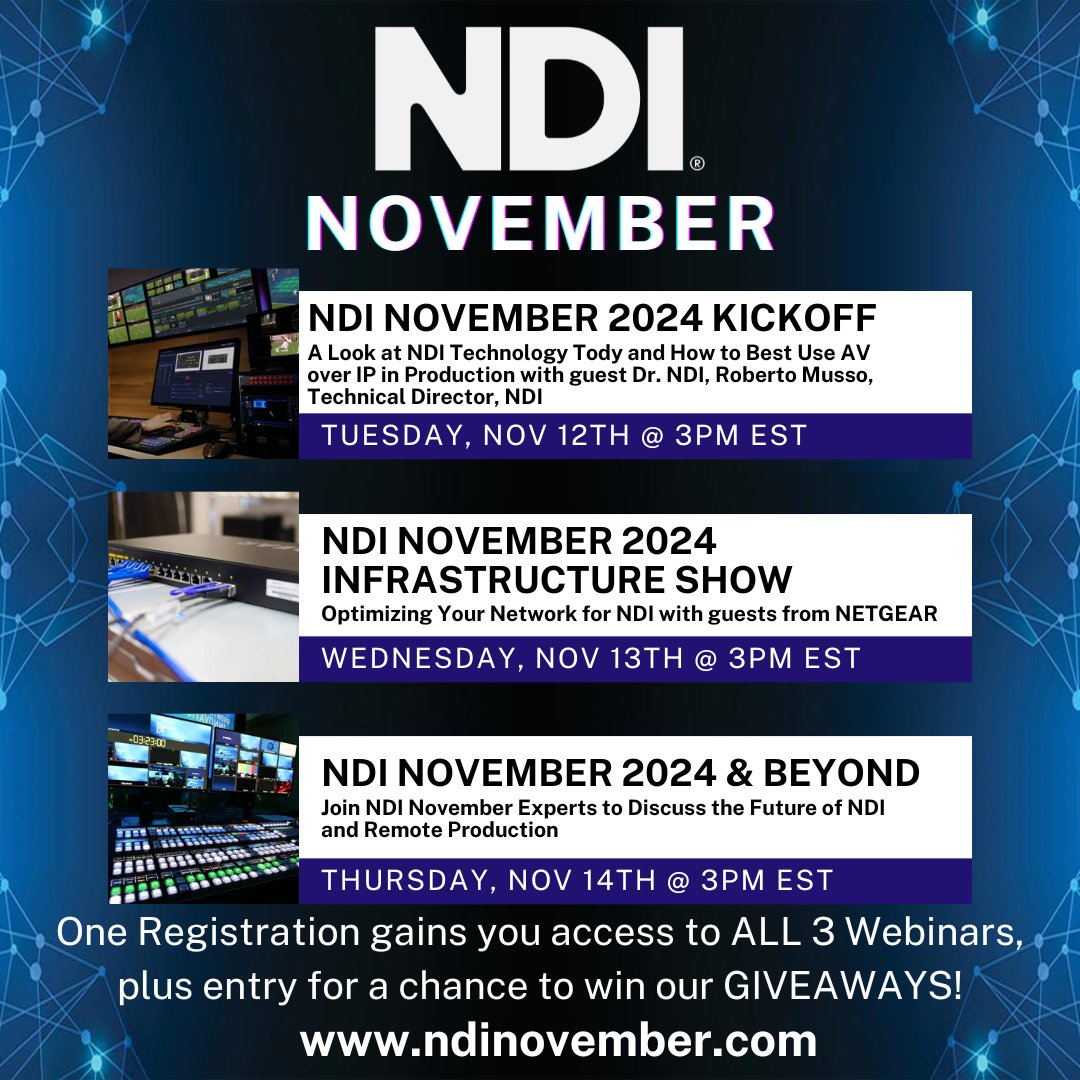 We will be hosting our 5th annual NDI November virtual event series where we will guests from the top NDI partners in the industry including case studies, installation success stories, product spotlights and more! NDI November is a month of live webinars highlighting the exciting technology for Video and Audio over IP.
