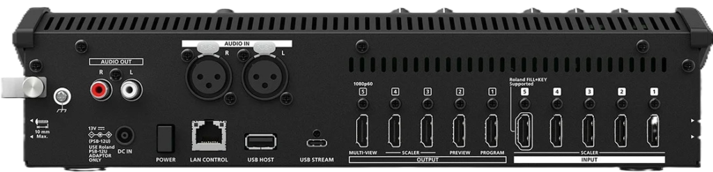 The five video inputs and six total outputs (HDMI plus USB streaming) offer flexibility for a wide range of production needs. In addition to program, preview, and multi-view outputs, output channels 3 and 4 can be assigned to any output bus and any input signal via 4K-to-HD downscalers.