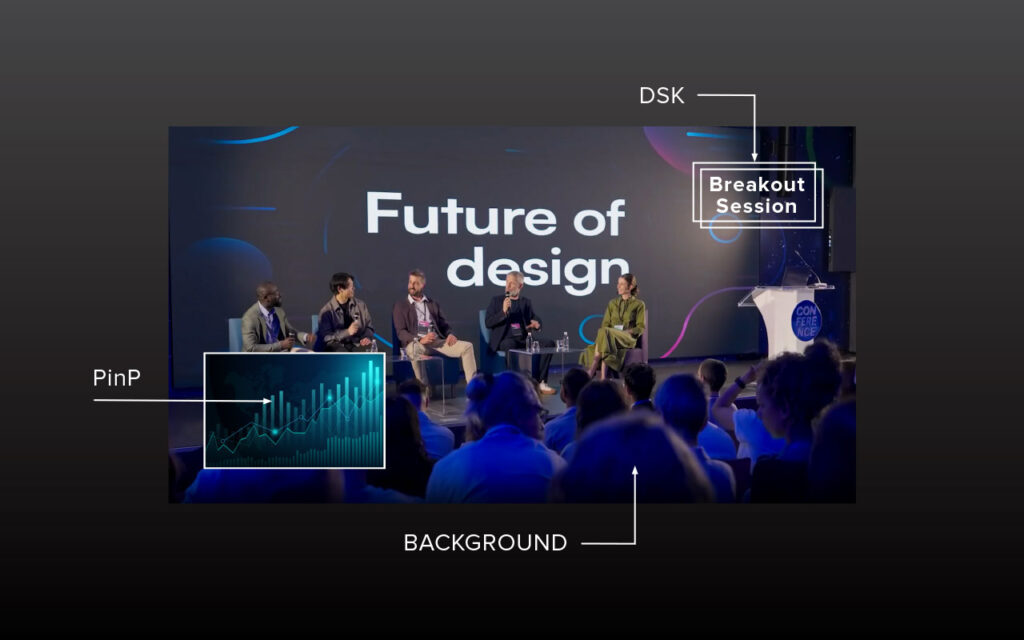 The ROI (Region of Interest) processor lets you compose up to four shots from a single 4K camera image, such as a wide shot of the stage, a medium shot of a speaking panel, and close-ups of each speaker. This powerful feature elevates your production value without increasing camera count, complexity, or costs.