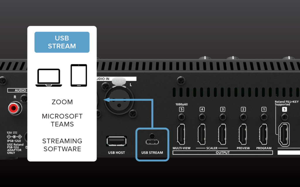 The V-1-4K uses the same connection technology as webcams for a plug-and-play streaming experience. Simply connect the USB-C output to a computer and start streaming with Zoom, Microsoft Teams, or any streaming platform that supports a standard webcam connection.