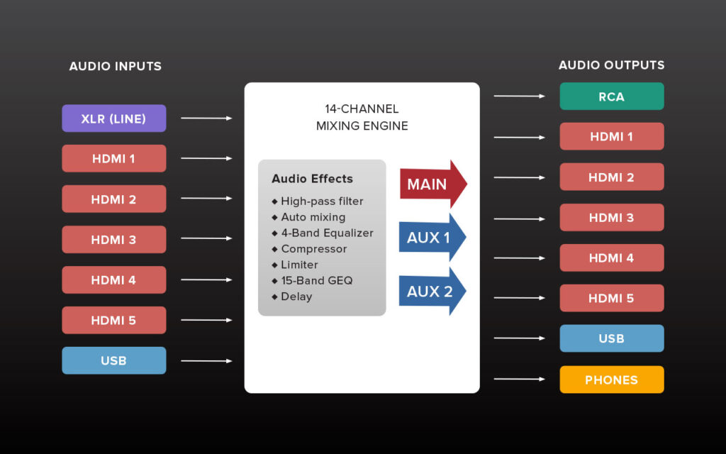 The V-1-4K features 14 channels of audio mixing and a wide selection of processing tools, including equalizers and compressors. There are also sync delays on all input and output busses to align audio with video if needed. I/O routing options include main, monitor, and two aux buses supporting complex audio configurations for hybrid events.