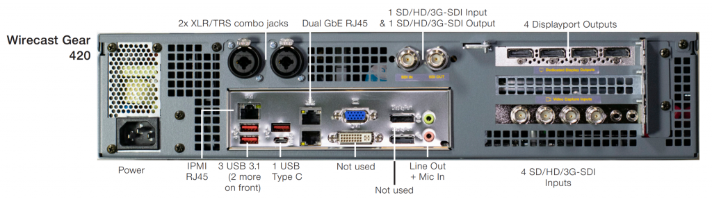 All three models come in a rackmountable 2RU chassis that can fit in a standard 19″ rackmount or run as a desktop unit with rubber feet included. The 420 I tested has the NVIDIA Quadro P220 graphics card, which includes four DisplayPort outputs and the four integrated hardware encoders referred to in Figure 2. As you’ll see, these really come in handy when outputting multiple streams of H.264-encoded output. The 420 also has one HD-SDI program out for confidence monitoring or to send to an external encoder, a workflow that some live-event producers favor over encoding in their mixer.