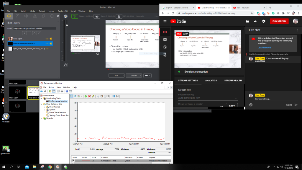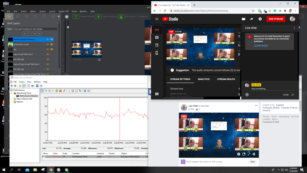 Figure 5 (below) shows Wirecast on the upper left, with a tiny preview window in the middle and the larger Live screen on the right. I’m sending the stream to YouTube Live, which is shown on the upper right. Performance Monitor on the lower left shows CPU utilization at around 10%, despite sending a 4Mbps stream to YouTube.
