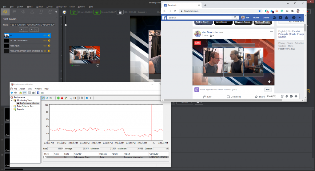 I broadcast this production to both Facebook and YouTube and saved all four cameras as ISO streams and the live output to a 10Mbps archive file. This pushed CPU utilization to a peak of around 80% and caused 10 dropped frames, all at the start of the broadcast and storage process. This is a bit higher than I’d like to go, though the average of 60%–65% should be fine.