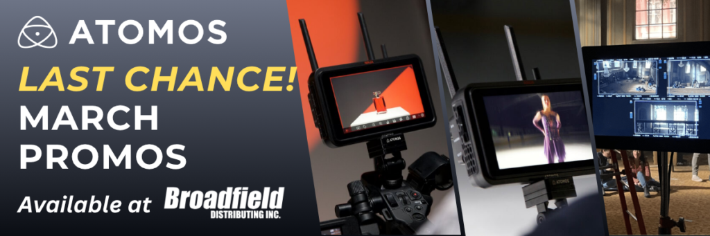 Take advantage of Atomos March promotions now available at Broadfield! Save on the Ninja TX and Ninja TX GO, plus get a free accessory kit with Ninja and a free sunhood with SUMO 19SE bundles. These promos are running from March 1st – 31st, 2026. Don’t miss these limited-time offers—call your Broadfield sales rep at 800-634-5178 for details today.