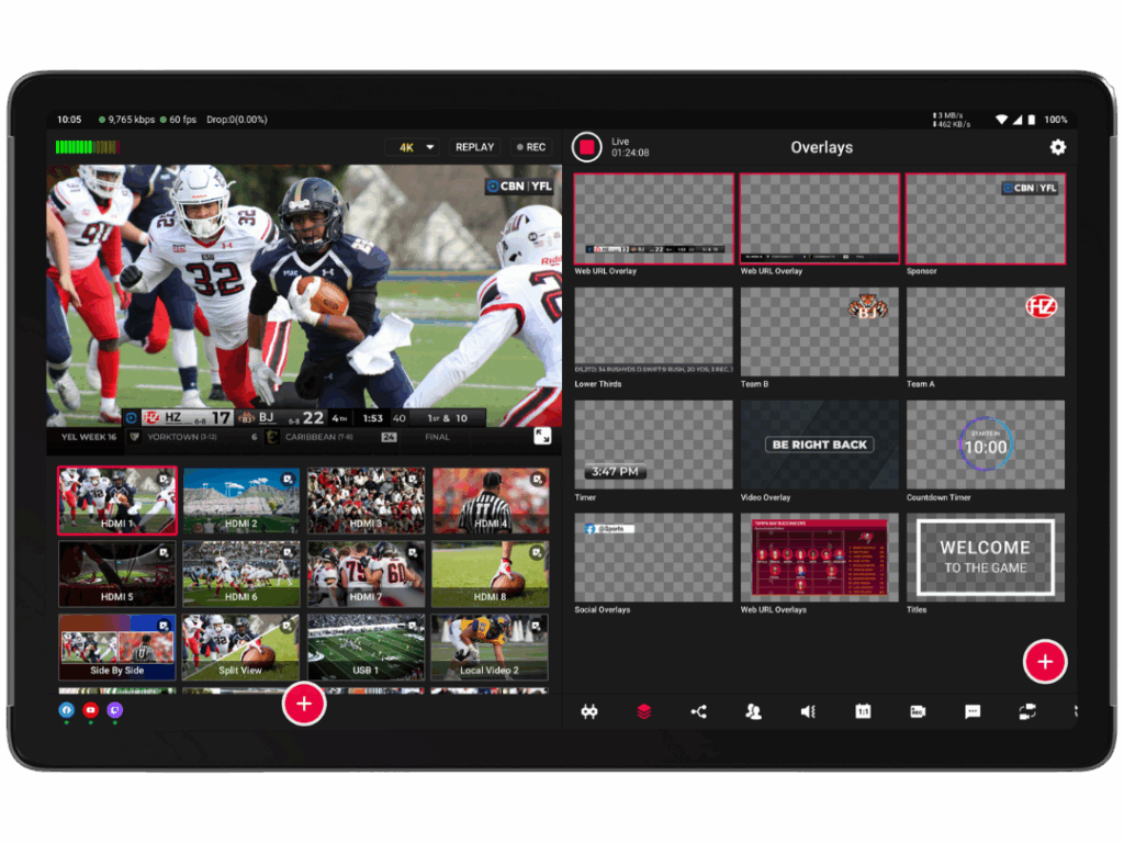 I’ve written about the Yolo Box before. It’s the Android-based tablet with live production software and hardwarebased connectivity. It marries the capabilities of software, the input output of hardware and the portability of a tablet. This market has other entries from Magewell, the director and the director 1 and Sinetri. But Yolo is not only the pioneer in the segment, they also offer the most diverse solutions from the single input mini to the 8 input extreme. It’s a production studio in a tablet. physical inputs, NDI, SRT, RTMP, web inputs, stills, video playback, PDFs. They can all be mixed individually or in self-created multiv- views. You’ve got built-in titles, graphics, scoreboards, audio mixing, viewer comments, remote guests, background music, instant replay, and all of that is handled inside the box. The Extreme can also record internally, both program and ISO feeds up to a frame rate data rate limit. You can encode for streaming. You can multiccast one stream to three different destinations. You can leverage optional integrated bonding capability and have the box auto switch, including switch the video to follow the audio. The internal audio mixer handles each input separately. You can turn channels off. You can solo. You can even do mix minus. So, if you’re self-hosting, you don’t hear yourself with a delay in your headphones. The Extreme is based around a large 11 in or 28 cm OLED screen offering a,000 nits of brightness. It has eight HDMI inputs. Five are autosensing 4K inputs and the other three are manually set HD inputs. There are also two HDMI outputs that can be assigned as program to mirror the YOLO box’s own screen, a customizable multiv- view, or you can select one of the individual input sources. Connectivity includes the gigabit Ethernet, internal cellular, and Wi-Fi. Plus, the Yolo Box will also leverage USB connected sources like a USB modem or a USB to Ethernet dongle for bonding. The Xreme has userreplaceable antennas on either side. You can use the included antennas or use something bigger or something directional. You can record to internal SD card or USB. And USB can also be used with video converters. So adding SDI via USB converter is also possible. So given the [snorts] flexibility of the USB ports, I wish there were more than the two USBA ports and the one USBC. The second USBC is for 45 watts of power input only. Stereo microphone and a line input as well as a stereo headphone port round out the input and output. New to the Xreme, in addition to the many HDMI ports and the external antennas, is more functional feedback from the Yolo box itself. From onscreen CPU load in the menu bar to a pull down status screen that also shows temperature and memory load, as well as encoding and streaming details. For me, this is a welcome addition because it’s it’s still an Android tablet. you’re not going to add RAM, upgrade the GPU or the CPU, or anything beyond what it came with. So, knowing how hard you’re pushing it and what its limits are is the key. Yolo Live has also taken big steps in this regard with posted limitations as you go to adjust various settings like the dual HDMI out warns you about plugging and unplugging cables while in use, using both outputs at 4K, that the audio only comes out one of the outputs, and more. There are pop-up warnings about exceeding the frame rate processing of the chips inside as they can only process so many frames. And your ISO records, your replay, and your streaming all count against that tally. There are warnings about exceeding the total data rate since the Extreme can handle multiple 4K sources and ISOs. Again, you’re not going to open it up and drop in a 4,000 megabyte NVME stick. There’s also warnings about exceeding the total CPU load where it will most certainly start dropping frames, and that makes for sad video producers like me. I hate frame doubling. You come away with an understanding that this is not a $10,000 gaming PC that has an i9 with 24 cores and 32 threads. This is not outfitted with multiple NVME drives at 4,000 megabytes per second. And this does not have an Nvidia 5090 or an A4000 in it. It also doesn’t suck 2,000 watts. This is just an Android tablet. So, the end user needs to adjust their expectations accordingly. At the same time, you’re not going to slip that $10,000 gaming PC into a tiny laptop sleeve, and it’s not going to run off a battery for hours. and it doesn’t include eight video inputs either, nor the well-designed Yolo Box software. The Yolo Box A sell excels at portability and ease of use. The Yolo Box interface itself continues to be revised and updated. There’s still a few user interface irregularities like changing the setting for video source switch or streaming mode gives you a popup while other settings take you to a separate dedicated page depending upon the amount of content or the conditions you need to be aware of. I also feel that several of the top level access panes control things that really ought to be buried in settings like bonding, streaming destinations, recording settings, transition settings. Those are all set once for a project and then just get them out of my way. During a show, I need access to my inputs, my overlays, comments, and the audio mixer. If you’re doing sports, you need replaying the scoreboard. Most everything else does not need to be in a tople ready access pane. But otherwise, the YOLO team continues to deliver a very intuitive user interface that despite its simplicity, delivers considerable power and capability to even the firsttime user. Do you want to do a green screen? It’s just seven taps, including picking the replacement background, and you’re done. Want to build a side byside multiv- view with borders and backgrounds? That’s just seven taps. Do you want to invite remote guests? You need their email address and six taps later, you’re done. You’d be hardressed to find anything simpler. And ea