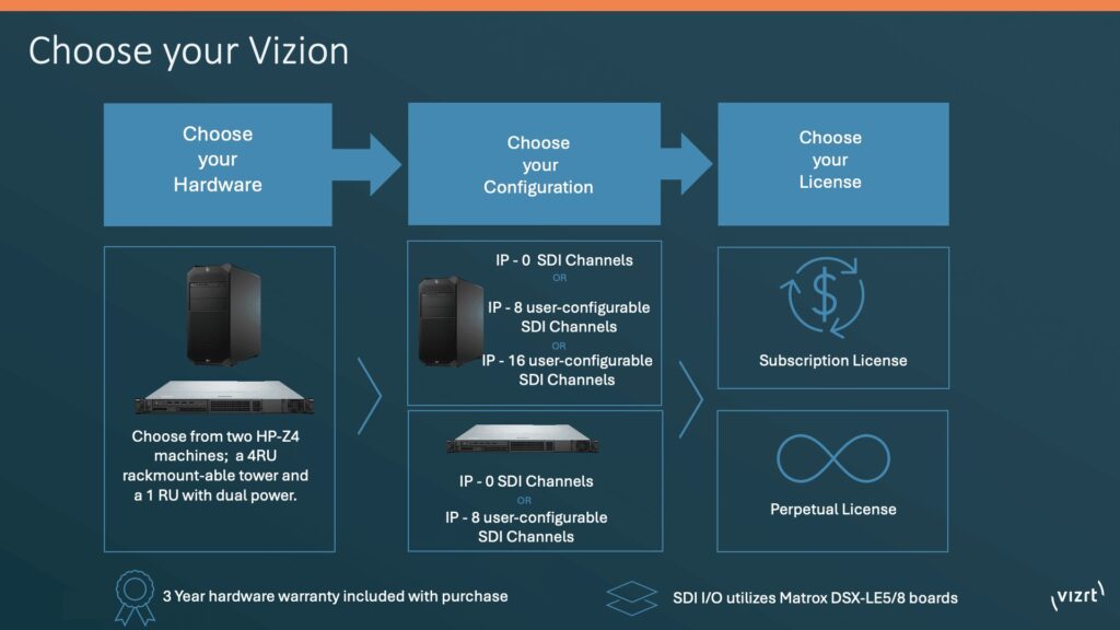 Available with either a perpetual or subscription license, Vizion gives you the freedom to choose the payment model that fits your business. Plus, with two hardware platforms and up to 16 configurable 12G SDI input/output options, you can adapt and scale as your production needs grow.