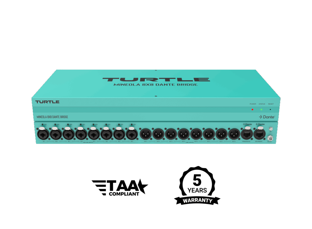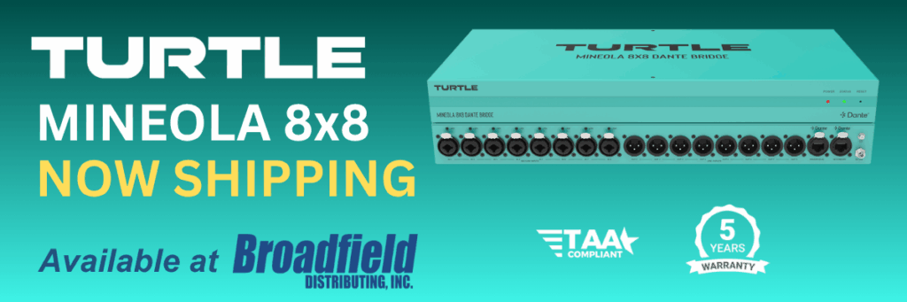 The Mineola 8×8 Dante Audio Bridge from Turtle is Now Shipping! The Mineola 8×8 delivers pristine audio and seamless Dante-to-analog integration with 8 XLR inputs (48V Phantom Power) and 8 locking XLR outputs. Perfect for live events, broadcasts, and installations, it offers exceptional performance and flexibility for professional setups. Call your Broadfield sales rep at 800-634-5178 for more information and availability!